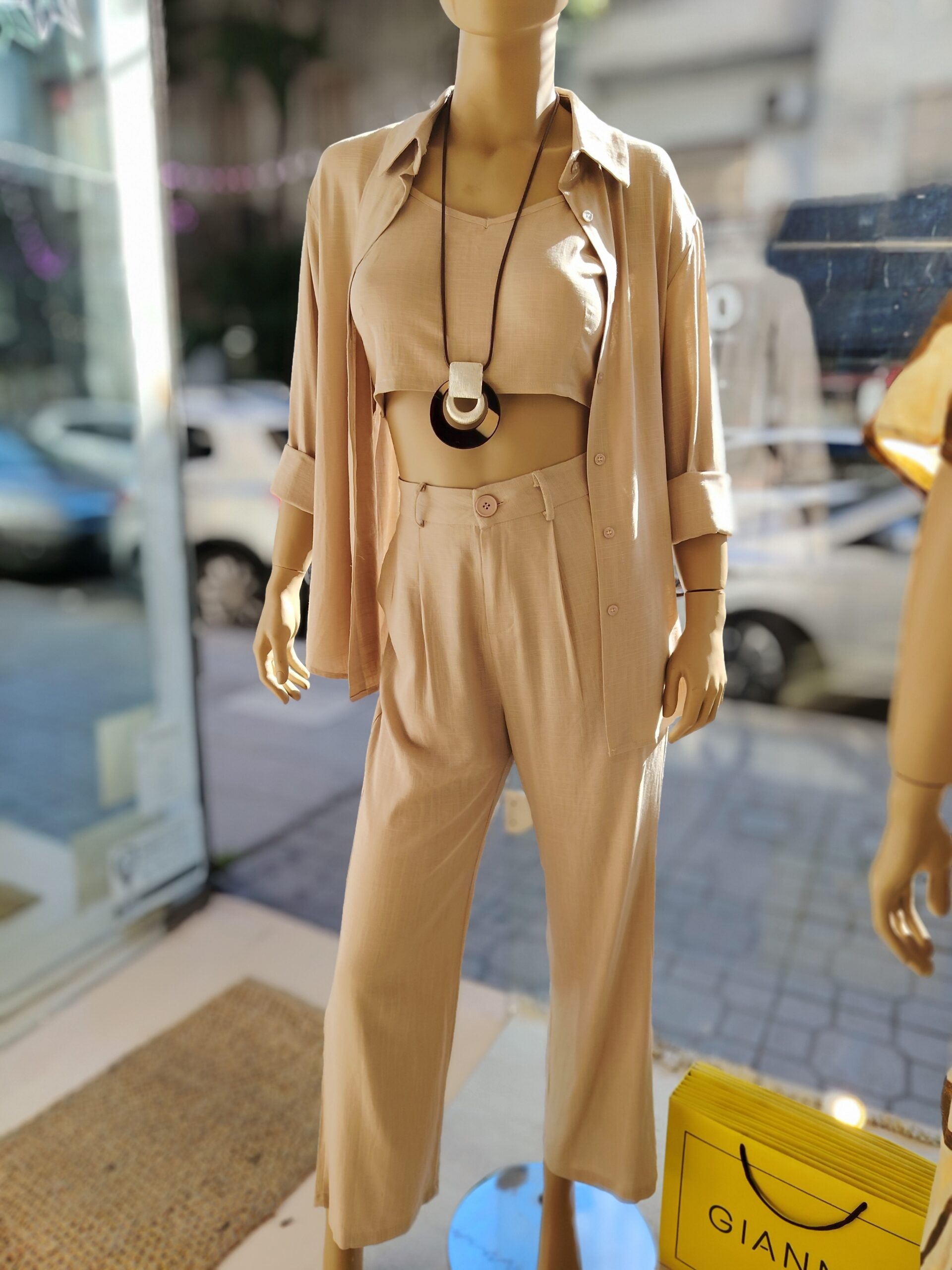 Conjunto de 3 piezas, top, camisa y pantalón, de lino.