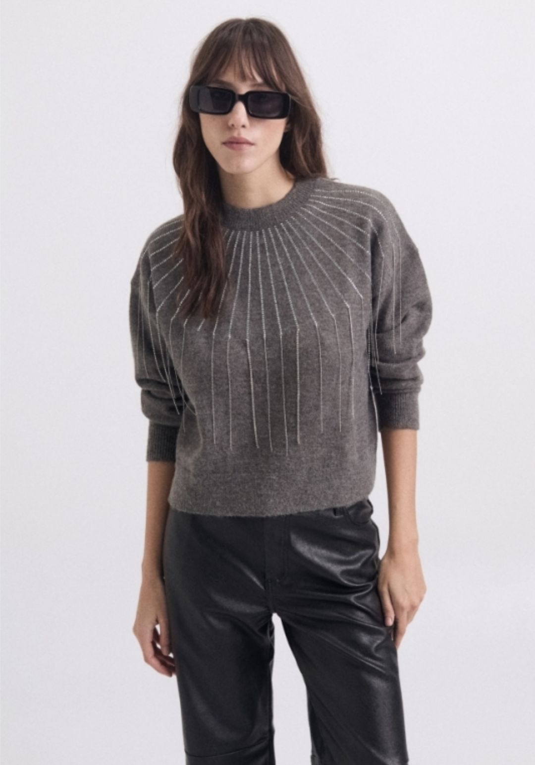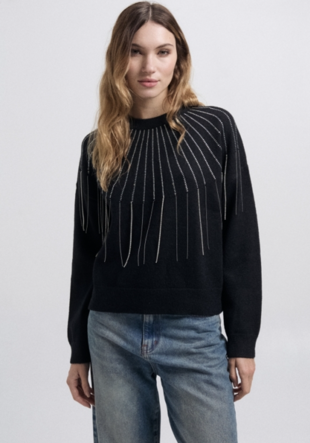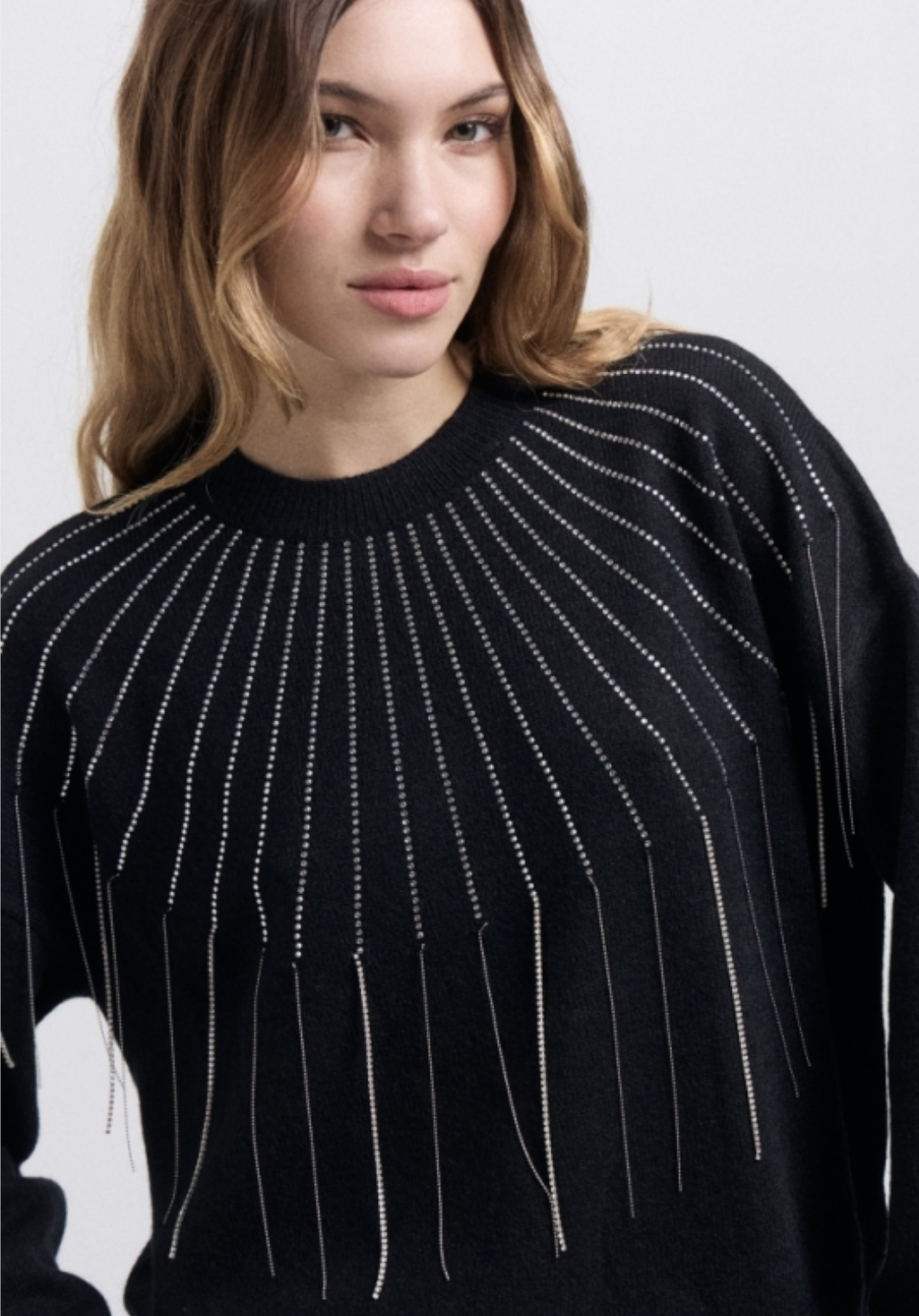 Tiene detalle de strass en delantero que finalizan en finas tiras plateadas.